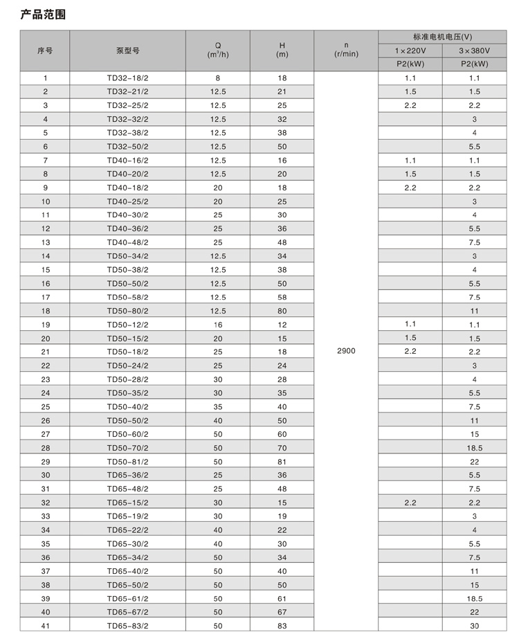 TD 泵是一種多用途產品,可以輸送從自來水到工業液體的各種不同介質,主要作為液體的輸送、增壓和循環設備使用。例如: